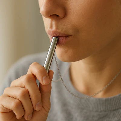 Breathe in as usual, then exhale gently through the pendant. The built-in resistance automatically slows your breath.